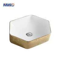 Elevate bathrooms with MWD's hexagonal ceramic vessel sink. Metallic inlay textures (gold/silver/copper) + geometric design. luxury basin for wood/stone vanities.